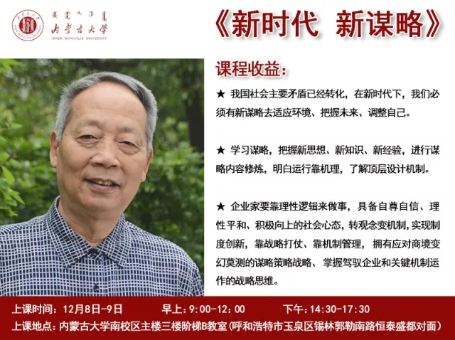 上课地点:内蒙古大学南校区主楼三楼阶梯B教室(呼和浩特市玉泉区锡林郭勒南路恒泰盛都对面)